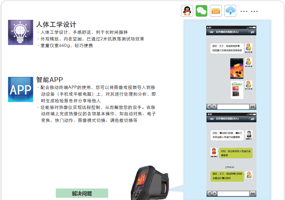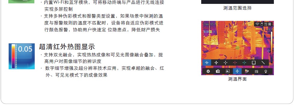 支持通過wifi及(ji)藍牙和智能設備(bei)連接,它可随時聯(lian)網自🚶♀️動升級熱像(xiang)軟件功能,還可以(yǐ)随時用網絡分享(xiǎng)🚶♀️現場的熱像圖片(piàn)