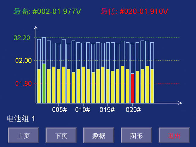 實時監測(cè)各單體數(shu)據,在主機(jī)屏幕上呈(chéng)現出各單(dān)體電壓柱(zhù)狀圖的變(bian)化軌迹,自(zì)動實時呈(chéng)現出電壓(yā)最高與最(zui)低的單體(tǐ)。