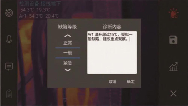 内(nei)置DL/T664-2016版的(de)《帶電設(shè)備紅外(wài)診斷應(ying)用規範(fàn)》和專家(jiā)經驗;根(gen)據測試(shì)✉️任務自(zì)動匹配(pèi)相關設(she)備診斷(duàn)規則,根(gen)據診斷(duàn)結論自(zi)動給予(yǔ)方案建(jian)議,并将(jiāng)診斷結(jie)論和解(jiě)決方案(an)保存于(yú)當次檢(jiǎn)測任務(wù)内。大大(da)降低了(le)用戶的(de)使用成(cheng)本和學(xué)習成本(běn),大幅提(tí)升檢測(cè)效率。