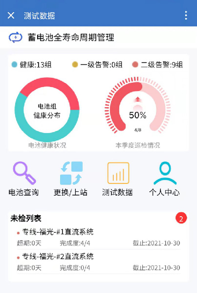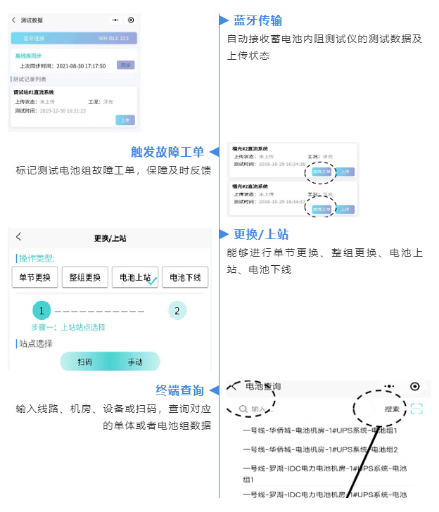 手持式終(zhong)端通過藍牙(yá)連接與FBR-6000NT進行(háng)雙向數據同(tong)步,成功連接(jie)識别後終端(duan)“小程❄️序”可以(yǐ)直接顯示 作(zuo)業任務信息(xī)以及完成情(qing)況統計信息(xī),自動接收雲(yún)端智能平台(tai)上創建的測(ce)試蓄電池組(zǔ)🌈信息♈,并手動(dòng)同步到蓄電(diàn)池内阻測試(shì)儀上。