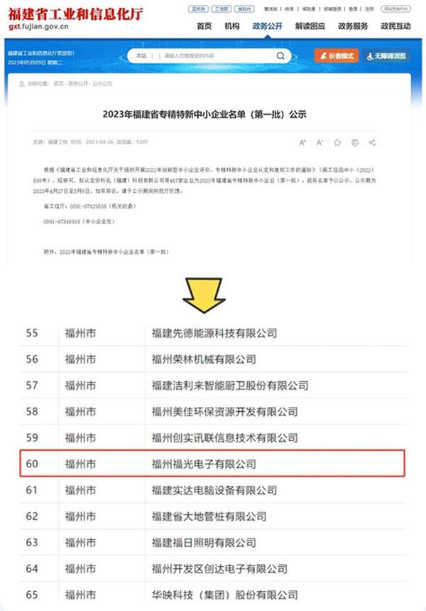 12月14日,福(fu)建省工業和信息(xi)化廳發布《2023年福建(jiàn)省專精特新中小(xiao)企業名單(第一批(pi))公示》,福州福光電(dian)子有限公司順利(li)通💜過審核并且完(wan)成公示,被評爲福(fú)建省“專精特新中(zhōng)小企業”和“創新型(xing)中小企業🏃♀️”兩項殊(shū)榮 ,這是政府部門(men)對福光電子在電(diàn)源檢測領域專業(ye)度以及❄️市場地位(wèi)的認可,也是福光(guang)電子三十年來堅(jiān)持創新的又一成(chéng)果。