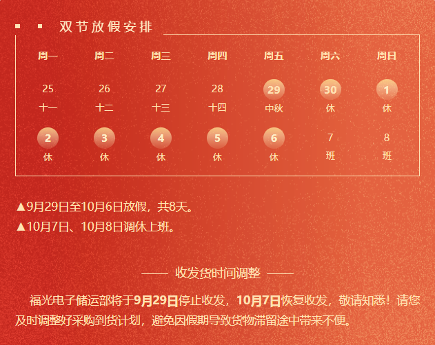 月圓(yuán)人團圓,讓我們一(yi)起感受中秋佳節(jiē)的溫馨和祥和,在(zai)國慶與國同慶。福(fú)光電子預祝大家(jia)節日快樂、阖家團(tuan)圓、身體健康、萬事(shì)如意!祝福我們偉(wěi)大的❓祖國繁榮昌(chāng)盛、國泰民安。