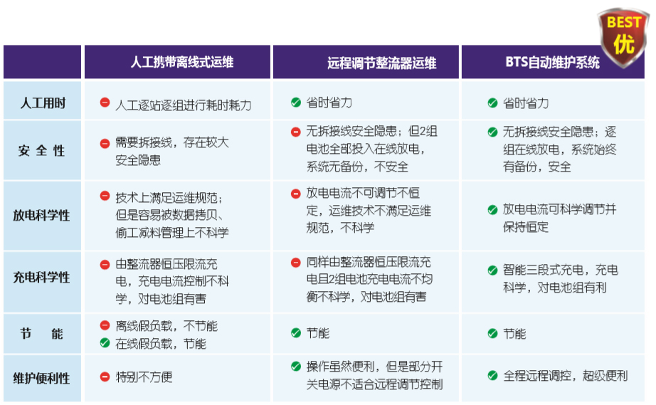 結論:BTS系統從(cóng)人身安全、放電科(kē)學性、節能環保、維(wéi)護便利性等方面(miàn)各項指标均優于(yu)傳統維護技術
