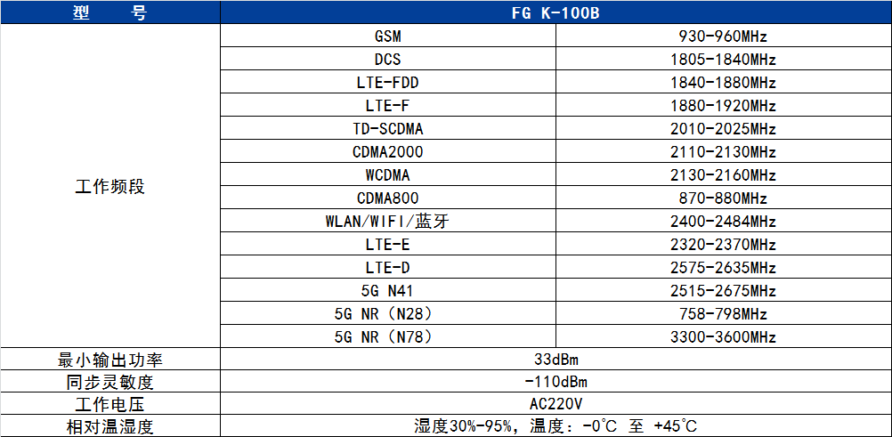 FG K-100B全網(wang)型數字信(xin)号屏蔽器(qi)能夠有效(xiao)屏蔽手機(ji)2G/3G/4G/5G以及Wifi和GPS。其(qí)發射功率(lǜ)大,覆蓋範(fan)圍廣,可長(zhǎng)時間穩定(dìng)持續工作(zuò),同時對TDD、5G基(jī)站上行無(wú)幹擾。主要(yao)應用于監(jian)獄、考場、保(bao)密㊙️會議、學(xué)校等需要(yào)保密性場(chang)所。