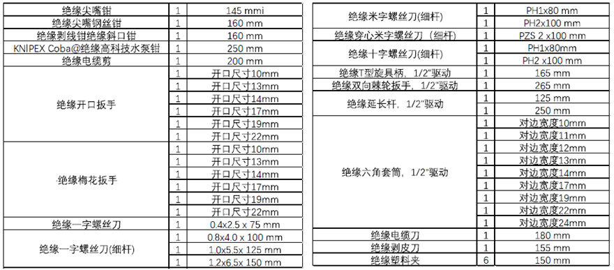 ● 包含:電工(gong)絕緣鋼絲鉗、電工(gōng)絕緣剝線鉗 、電工(gong)絕緣斜口鉗、電🔞工(gong)絕緣水泵鉗、電工(gong)電纜剪(雙剪切口(kǒu))、電工絕緣 開口扳(ban)手 、電工絕緣梅花(hua)扳手、電工絕緣一(yi)字螺絲批、電工絕(jue)緣T型旋具柄、電工(gōng)絕緣雙向棘輪扳(ban)手、電工絕緣接杆(gan)、 電工絕緣六角套(tao)筒、電工絕緣❤️電纜(lǎn)刀、電工絕緣剝皮(pí)刀、電工絕緣線夾(jiá)、電工手套💃、電工絕(jue)緣墊☀️等🏃🏻♂️47件工具