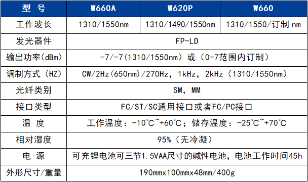 W660系列(lie)手持式激光(guāng)光源安裝有(you)1~2個激光器,可(kě)發出1~4個波長(zhang)🔅的🧡穩定激光(guāng)。支持連續波(bo)和調制波輸(shu)出、具有自動(dong)🈲關機🥰、單鍵💃切(qie)換波長、提供(gòng)650nm可見紅光,電(dian)池低電壓檢(jian)測✌️等實用🈲功(gong)能,并㊙️可向單(dān)模光纖💃提供(gong)1310nm和1550nm的雙向波(bo)長激光輸出(chū),廣泛用于光(guang)纖網絡領🌈域(yù)的安裝、運營(yíng)和維護工作(zuò)。